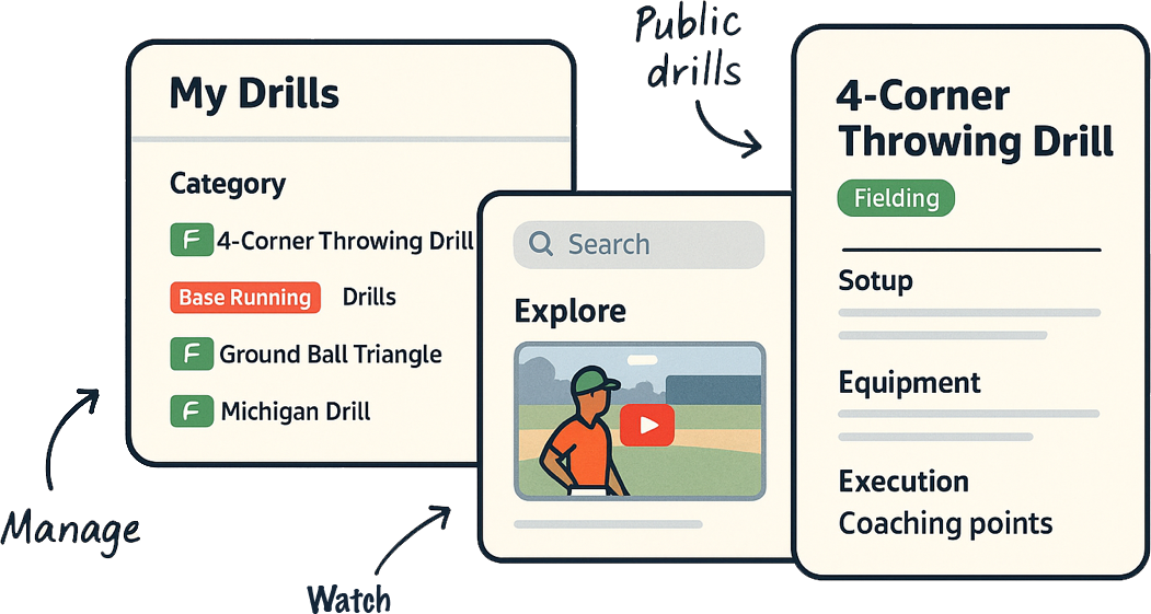 Create your own drills with categories, instructions, notes, and optional videos, all neatly organized for quick planning. Browse your personal collection or explore public drills shared by other coaches as the community grows.