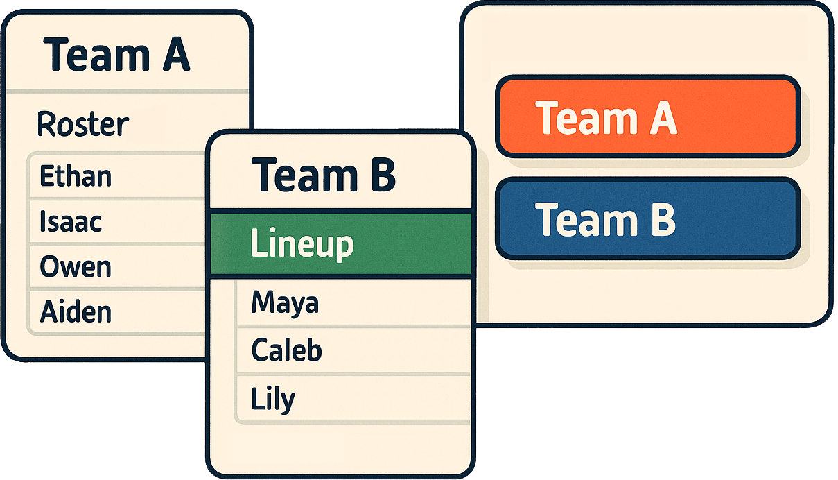 Create as many teams as you need and keep rosters, lineups, schedules, games, and seasons completely separate—no mix-ups, no confusion. Switch between teams instantly from one dashboard. Perfect for clubs, leagues, coaching staffs, and busy parents.