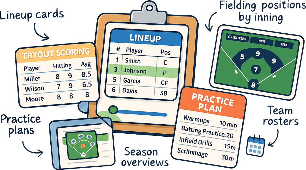 Every key part of your coaching workflow is print-ready: lineup cards, fielding positions, tryout scoring sheets, practice plans, drill diagrams, rosters, and season overviews. Whether you prefer digital or need a paper backup on game day, you're never stuck without the info you need.